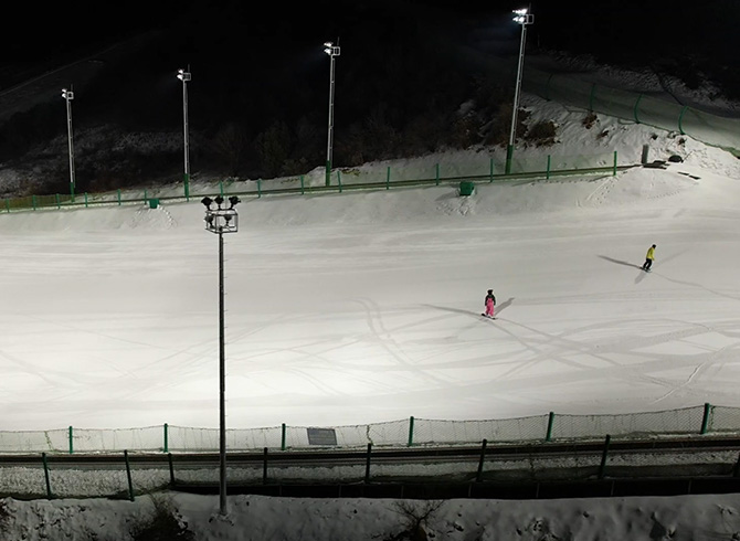 2023-2024雪季已于2023年11月28日開放夜場滑雪,后山增設(shè)初中級滑雪道夜場燈光,除高級道外全部點亮。此次燈光亮化采用一體化光學(xué)器件設(shè)計的賽倍明S350 LED投光燈。不同于市場上常見的使用塑料透鏡的點陣式排列燈具,賽倍明燈具高密度LED光源后置,通過高精度弧形純鋁反射器充分混光,玻璃透鏡單一出光面,表面光均勻,沒有極端亮點,能夠有效降低眩光。戶外長期使用,光效穩(wěn)定。